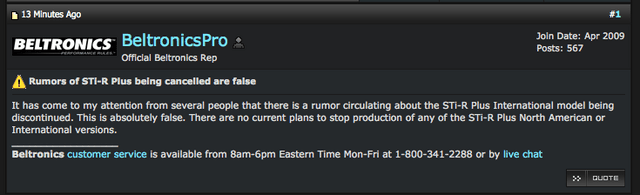 Hace unos días, leímos en otro foro que, según información de alguien de dentro de Beltronics, el Beltronics STI-R se dejaba de fabricar, y que solamente se iba a vender lo que quedaba.