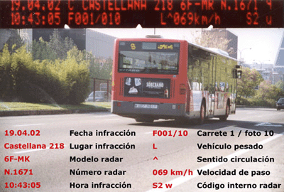 En función de las diferencias en la frecuencia entre la señal emitida y de la señal que recibe rebotada por el por el vehículo el radar determina la velocidad a la que circula el vehículo y si esta es superior a la velocidad permitida en dicho tramo, disparara una cámara fotográfica, en la que sobreimprimen sobre el vehículo la velocidad a la que circulaba, el nombre de la vía, la fecha, la hora…