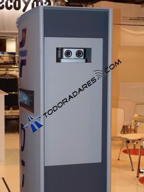 Si os fijáis en la caja, dispone de unas chapas laterales rectangulares que, retirándolas, permiten poner los sensores del Autovelox (láser de barrera) bien con la caja en el lateral derecho (retiran la chapa izquierda), bien en el arcén izquierdo (retiran la chapa derecha, como en el ejemplo de la foto). En el frontal puede observarse la cámara con los dos objetivos.
