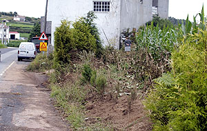 Algunas fotos del accidente de Malpica. En la primera foto se ve la cuneta y las piedras que hicieron de trampolín. En la segunda se puede observar la defensa del subaru en primer termino, y el edificio sobre el que se empotraron a 5 metros de altura.