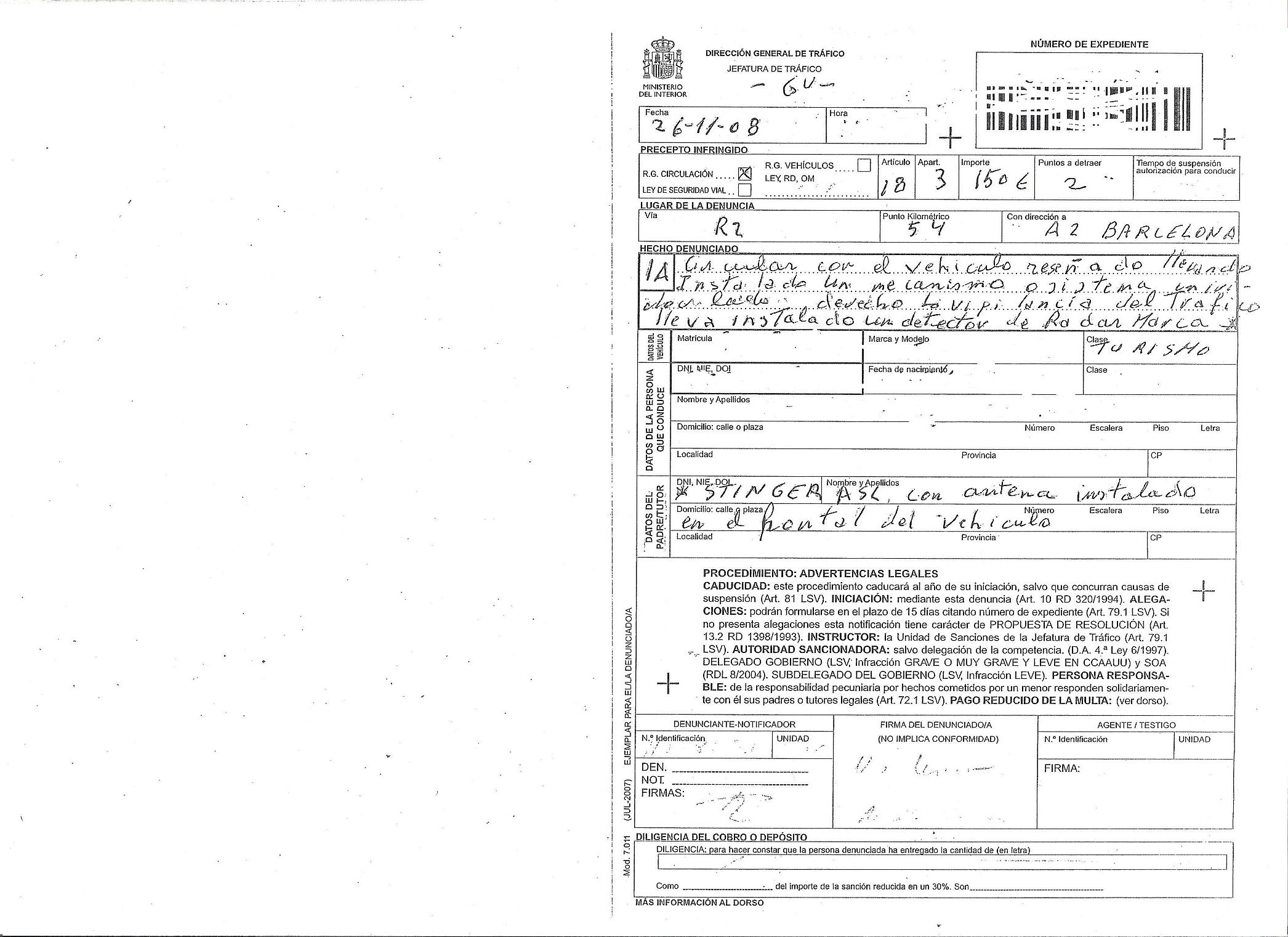 1A: Circular con el vehículo reseñado llevando instalado un mecanismo o (deduzco que pone) "sistema inividor lado derecho" vigilancia del trafico lleva instalado un detector de radar marca*
