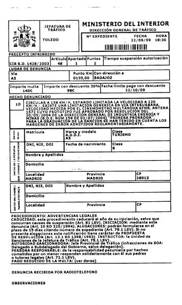 josix69 Publicado 14 de Noviembre del 2009 Reportar Publicado 14 de Noviembre del 2009 (editado) Bueno chicos espero que me podais ayudar un poco, os cuento un poco la historia. El dia 22/09/2009 me cazaron a 158 en un tramo de 120, me pararon y me dieron la multa en mano. El guardia civil me dio la opcion de pagar con el 30% y me dijo que podia pedir luego la foto o recurrir sin problemas, acepte pensando q lo de si pagas no puedes recurrir todavia no estaba aprovado (o eso pense, nose si lo estara, si me lo podeis aclarar seria una gran ayuda). [ATTACH]4138[/ATTACH] Bueno mande el recurso para pedir la foto y hoy dia 14/11/09 me llega un certificado (imagen adjunta "recurso") pensando que era la foto pero no es asi y recibo esta notificacion. [ATTACH]4139[/ATTACH] Nose si esto estara bien y estoy yo confundido o me la estan intentando clavar. Bueno mi pregunta es: ¿la ley de que si pagas con es descuento renuncias a recurrir estaba vigente en la fecha o es posterior? Y si todo esta bien y soy yo el que esta equivocado me gustaria que me dijerais si hay alguna forma de intentar recurrir o hacer algo para por lo menos recuperar los puntos. Bueno maestros disculparme por el tocho pero he intentado poner todo lo mas claro y con la mayor informacion posible para que sea mas facil ayudarme y si me falta algun dato que os haga falta os lo colgare encantado. Muchas gracias de antemano. Editado 17 de Noviembre del 2009 por josix69 Citar