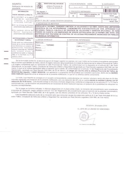 tanucho Publicado 2 de Diciembre del 2010 Reportar Publicado 2 de Diciembre del 2010 Hola a todos!! Primeramente decir que, como conductor, me siento acosado!! Me ha llegado una multa de 300 euros por no identificar al conductor, seis meses después y tras identificarme, la multa de 100 € por exceso de velocidad; Pone que es un radar fijo en la Autovía de Pinares, la A-601, en el km 99.7. creo que está por Carbonero el Mayor (me pone que estaba indicado en paneles informativos) ¿Alguien ha visto un radar fijo en esa carretera? Gracias Citar