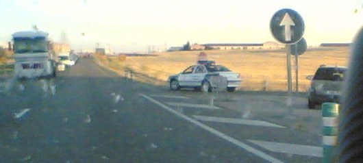 ...A6 dirección Madrid, cerca de Urueña (subiendo una pendiente que tiene un área de descanso a cada lado de la carretera, a ver si mañana puedo fijarme el punto km) estaba nuestro amigo Lybra verde, en la mediana....¡apuntando de frente! ...
