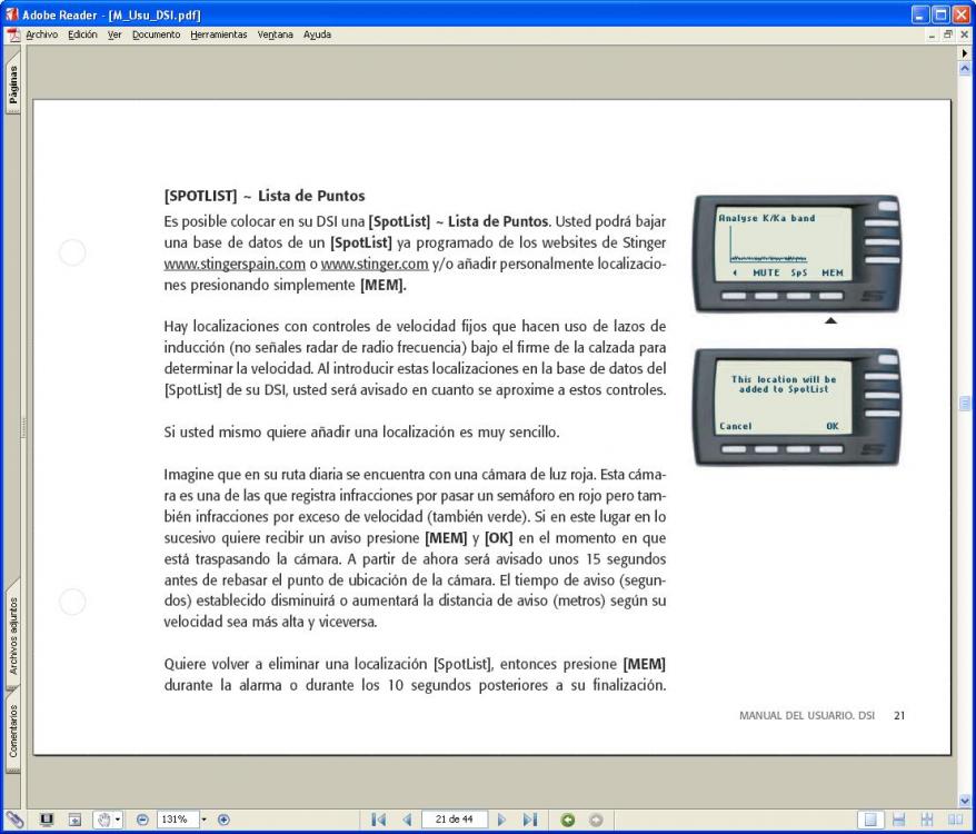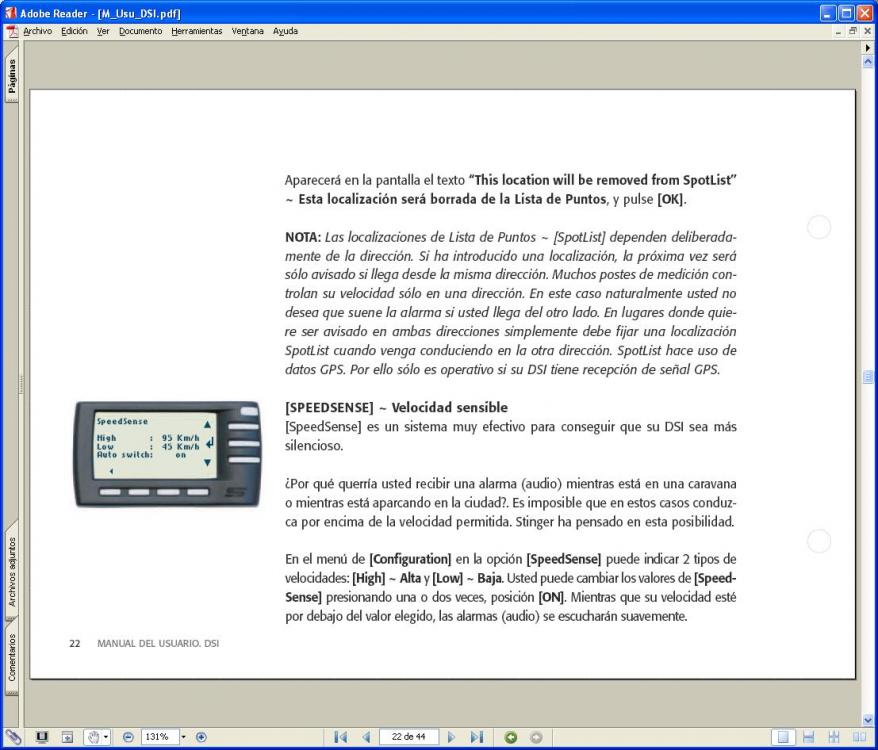 Bueno deciros, que ya ha llegado, el software en español del DSI, y lo mejor, los Pois, de España, Andorra y Portugal, gratuitos. Tambien una mejora de Software, (una última version) ahora ya está completito, faltaria el inhibidor laser por infrarojo, que anuncian en la web, pero esto creo que será a largo plazo. Con el sensor de aparcamiento de los compañeros de este foro creo que iremos mas que seguros, ya que ellos lo prueban todo. De momento los Pois (Spotlist, es como le llaman los de Stinger) funcionan todos los que he pasado por barcelona. Este finde me voy hasta Girona, a ver que tal. Aunque llevo el "Alerter" por si las moscas, que este tampoco falla. Espero poder postear los resultados el martes.