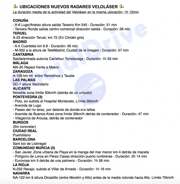 SocialDrive Publicado 21 de Abril del 2018 Autor Reportar Publicado 21 de Abril del 2018 Gracias por el aporte. Seguiremos trabajando en sus ubicaciones. No obstante recordamos que usar un detector de radares es actualmente ilegal desde el 9 de mayo de 2014 según la reforma de la Ley de la Seguridad Vial del 2014. Dicha sanción es de 200€ + 3 puntos (Más info) Además de ello cabe recordar que los detectores de radar no funcionarían con los nuevos radares Veloláser (Más info) Citar