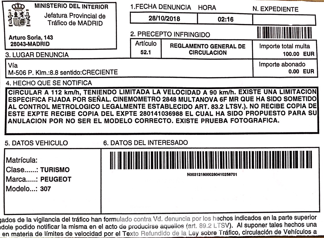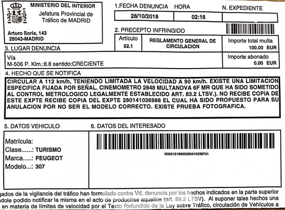 ivan1091 Publicado 8 de Diciembre del 2018 Reportar Publicado 8 de Diciembre del 2018 Hola a todos soy nuevo en el foro y quiero exponer un caso extraño que me a pasado y me gustaría que me ayudarais. La madrugada del 28 octubre en la carretera M-506 a la altura de la BP de Móstoles había un radar camuflado y no lo vi hasta que ya vi el flash, con posterior parada en la vía de servicio de Loranca junto a un macro control de alcoholemia. Me tuvieron parado 20 minutos, porque esa noche se hacía el cambio de hora y al imprimir la denuncia no lo consiguieron y me dieron el boletín escrito a mano.La multa es por ir a 112 con límite a 90 y es de 100€ y en la siguiente semana decidí pagar los 50€ de reducción,Pues ayer viernes recibo en el buzón una carta de la DGT notificándome la misma multa y donde redacta que el expediente anterior había sido propuesto para anulación y ahora me hacen que vuelva a pagar los 50€.Este lunes tenía pensado llamar a tráfico y que digan una solución.Que podría hacer frente a esto Y ponerle un solución? Muchas gracias. Citar