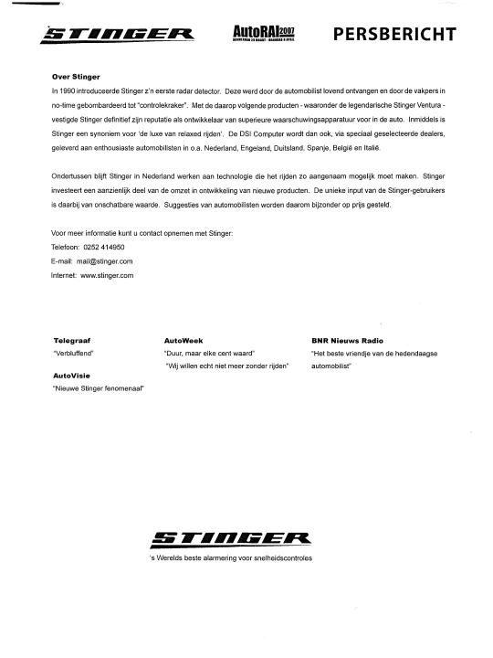 A300 Publicado 7 de Abril del 2007 Reportar Publicado 7 de Abril del 2007 TRADUCCION NOTA DE PRENSA STINGER DSI LASER Con ocasión de la feria AutoRAI (AMS 2007) Cortesía de ROBSER; gracias, te debemos una!!!!!!!!!!! STINGER presenta DSI Láser Module La mejor solución para alertar de controles de velocidad viene con protección láser solución total, con todas las ventajas de integración “plug and Play” con el Stinger DSI . Detección de láser flexible en “shielding”, ahí donde sea permitido. Instalación elegante, no necesita “parches” adhesivos pegados al coche. PRIMICIA. Stinger muestra en la feria Autorai 2007 un modelo de testeo del Modulo Láser. El Modulo Láser Stinger se integre sin fisuras con el Stinger DSI en añade con ello protección de Láser a las funciones ya existentes del DSI. Porque también en láser, Stinger tiene una reputación que mantener. Lasershield por ello es una invención y marca registrada de Stinger y el primer LaserShield ya fue sacado al mercado por Stinger en 1998. 3,2,1, Láser Tres aplicaciones inteligentes de láser. 3. Detección de láser 2. LaserShield 1. Top Secret (Secreto absoluto) Gracias a la detección de láser y lasershield, no hay mejor protección posible contra láser. El modulo DIS Láser ofrece una solución global contra láser. Como es sabido de Stinger DSI Radar Alertador, también la protección de láser será flexible en su aplicación. Dicho de otra forma, el usuario podrá activar o no la protección de láser en cada momento, según la normativa aplicable en su región. Como ejemplo: En los Países Bajos, la detección de láser esta totalmente permitida. Secreto Absoluto. Gracias al Modulo Láser, el DSI dispondrá de otra función única, la cual por motivos de petición de patente se anunciará más adelante. Instalación elegante. Gracias a los únicos “ojitos láser” o el soporte de matricula, la instalación de DSI Láser Modulo será fácil y elegante. De esta forma, los sensores láser de Stinger podrán ser instalados de manera discreta y no será necesario ponerlos de modo llamativa con parches en el coche o en medio de las rejillas. Disponibilidad. El modulo Láser estará disponible este verano y estará disponible en varias versiones. Un precio indicativo de la versión completa es de 495 euros. Lo consumidores pueden reservar desde ahora. --obviado el resto del comunicado por ser solo recordatorio sobre la historia de Stinger--- Citar