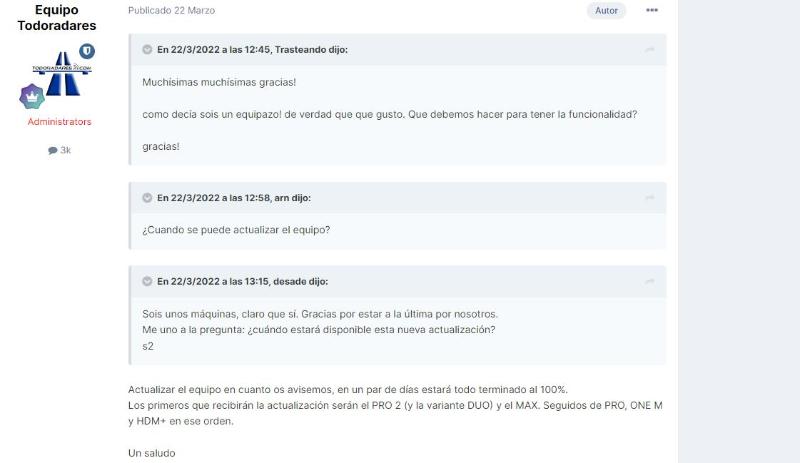 Equipo Todoradares Publicado 2 de Agosto del 2022 Reportar Publicado 2 de Agosto del 2022 hace 4 horas, FOCUS 16V dijo: Ya si empezamos hablar de escort beltronic975 o de kaza o shadow 7, me pare muy bien tu teoría, pero antes de escribir en el foro que hay un orden de actualización hay que asegurar. Actualizar el equipo en cuanto os avisemos, en un par de días estará todo terminado al 100%. Los primeros que recibirán la actualización serán el PRO 2 (y la variante DUO) y el MAX. Seguidos de PRO, ONE M y HDM+ en ese orden, que somo humanos nos podemos equivocar, yo no me invento las cosas que no se puede ya esta, CLF yo llevo muchos años en el foro siempre he comprado hay los detectores, sampat4 que también esta en otro foros también sabe aconsejar muy bien, pero a ti cuando hay algo que no te cuadra te pones a la defensiva, claro que hay diferencias como si te compras focus básico como si te comprar un rs claro que hay diferencia, pero poner diferencias no queda muy bien, dejamos aquí el tema no vamos a seguir con el tema. un saludo Ni recordaba que existiera ese post... Ese mensaje es del 22 de marzo cuando aún no estaba ni liberada la actualización para el PRO 2 ni el MAX (sólo había firmwares de prueba). La hoja de ruta era cargarlo en todos los equipos tal y como se explica ahí (siguiendo la política de Genevo de que todo lo que se pueda sea actualizable y gratuito) pero a la hora de empezar a planificar los trabajos para el HDM+ se vio que no era viable ni posible por limitaciones de hardware. Lo mismo ocurre con el ONE M, que aunque sí se puede añadir, requiere más trabajo y modificaciones que en el MAX, por ejemplo. Eso se traduce en más tiempo para realizarlo. Citar