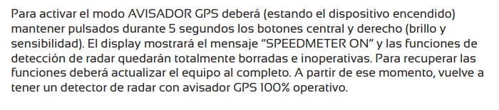 Equipo Todoradares Publicado 24 de Agosto del 2023 Reportar Publicado 24 de Agosto del 2023 hace 6 horas, jotaele1959 dijo: Holas. No sería malo que esas funciones pudieran realizarse de forma muy rápida y sencilla. Imaginemos que te paran. Se me antoja una "función secreta" en que el aparato funciona como detector sólo a partir de una velocidad; en parado o muy baja velocidad sólo como avisador. Todos los equipos Genevo desconectan la antena detectora por debajo de 30km/h. Esta velocidad es además configurable desde el menú. Por debajo de esa velocidad sólo funciona como avisador GPS. Si quieres tenerlo 100% legal, (inhabilita por completo las funciones de detección) tienes que mantener pulsados dos botones durante un par de segundos. Se tarda muy muy poco en realizar ésto. Un saludo! 1 Citar