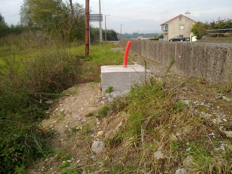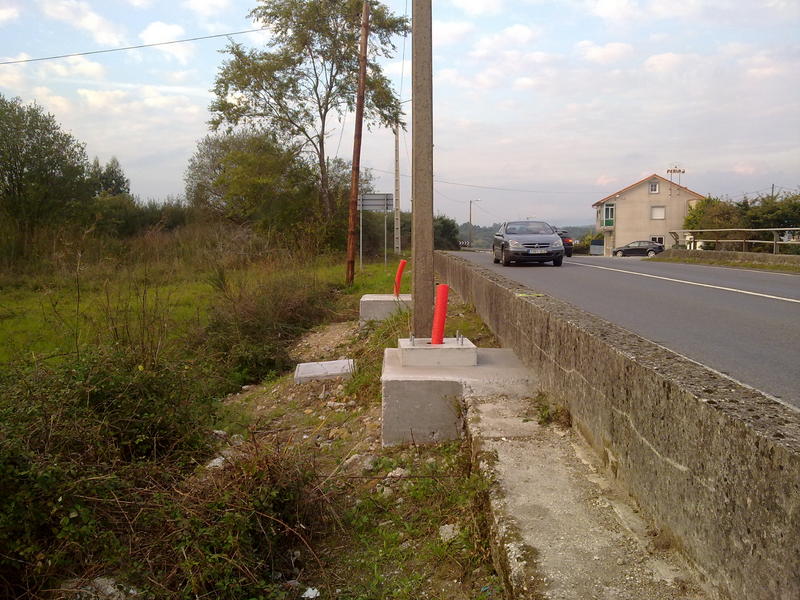 Unos metros más para atrás ( siempre dirección Padrón ) en la ligera curva que tiene "quitamiedos" de cemento, hay dos tubos rojos y en el muro una R en rojo pintada ¿ lo cambiarán de sitio ?