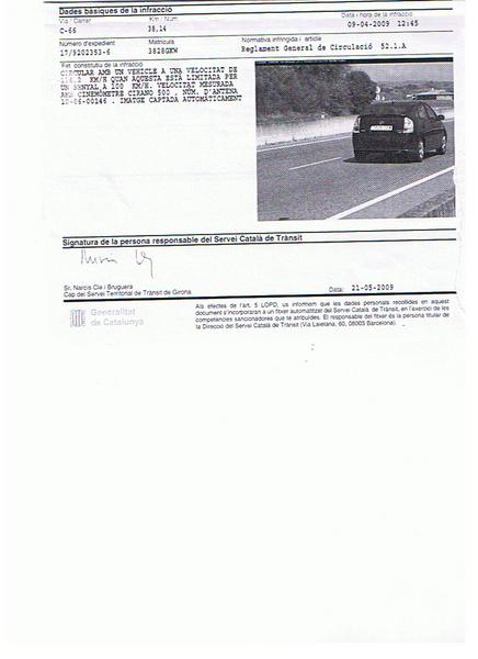 Cardineta Publicado 27 de Mayo del 2009 Reportar Publicado 27 de Mayo del 2009 Hola gent ! Este radar realmente existe. Unos ponen en su sanción que el PK es el 16,7. En mi caso es el PK 38,14 como podéis ver en la imagen que os adjunto de esa multa. Por desgracia era yo. El límite de velocidad es de 100 y yo me pasé de 18, 2 km., o sea, circulaba a 118,2. Todavía no me ha llegado la sanción pero supongo que no va a superar los 90 € y con una reducción de pronto pago del 50%. Ya veremos. A pagar toca... Ahí va la foto: (abrir archico adjunto) Saludos a todos i que guanyi el Barça avui a la final de la Champions !!! Cardineta<p><a href="https://www.todoradares.com/foro/uploads/monthly_2009_05/multa.jpg.0a97e4b0f279ef3ac85d37c46d8397e4.jpg" class="ipsAttachLink ipsAttachLink_image"><img data-fileid="2677" src="https://www.todoradares.com/foro/uploads/monthly_2009_05/multa.jpg.0a97e4b0f279ef3ac85d37c46d8397e4.jpg" class="ipsImage ipsImage_thumbnailed" alt=""></a></p> Citar