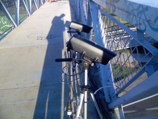 Como podéis ver, un monovolumen del que salían del maletero unos cables enganchados a dos cacharros (círculos rojos) montados sobre trípodes y apoyados en el suelo y enchufando hacia la autovía que pasa por debajo. Limitación a 80 (que ni de coña pasa nadie a esa velocidad).