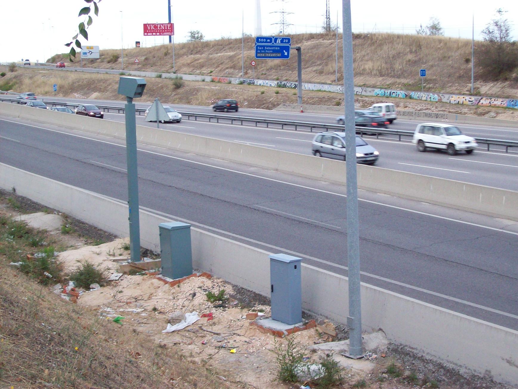 Cuidado porque en la M50 hay numerosos armarios blancos con unas ventanas rectangulares en la parte superior con una cámara dentro pero aunque parezca mentira no son radares sino cámaras que controlan y vigilan los paneles luminosos que veréis unos 200-400 mtrs más adelante. Confunden mucho pero seguro que no son radares de velocidad