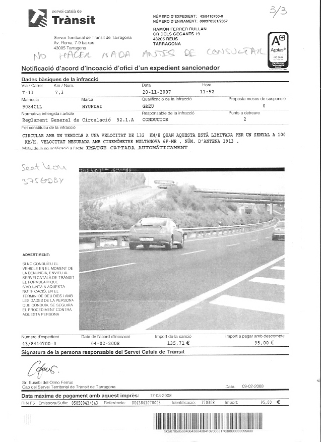 ami Publicado 19 de Febrero del 2008 Reportar Publicado 19 de Febrero del 2008 Llevo unos días desesperada mirando foros y finalmente me he decidido a escribir: T-11 km 14,13 (dirección tarragona), Radar Multanova 6F-MR 145 km/h (según dicen) a las 7:40h de la mañana 200 euros + 3 puntos En la foto se ven dos coches, ambos en el carril izquierdo y ninguno en el derecho (autovia). El mío sale centrado y el otro unos metros más adelante (cortado por la mitad, pero se distingue matrícula). El caso es que en el km 14 hay un radar fijo por todos conocido. Dudo si la foto es del fijo o de uno diferente movil. Lo que sí estoy segura es que la medida es erronea. Aparte de cagarme en el sistema, tengo alguna posibilidad? El seguro me dice que si reclamo pierdo la reducción del 30% en el pago, es cierto?. Gracias, Citar