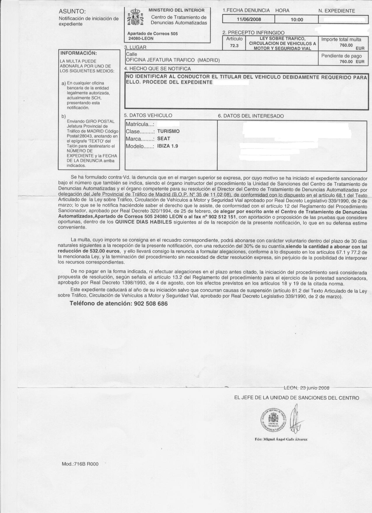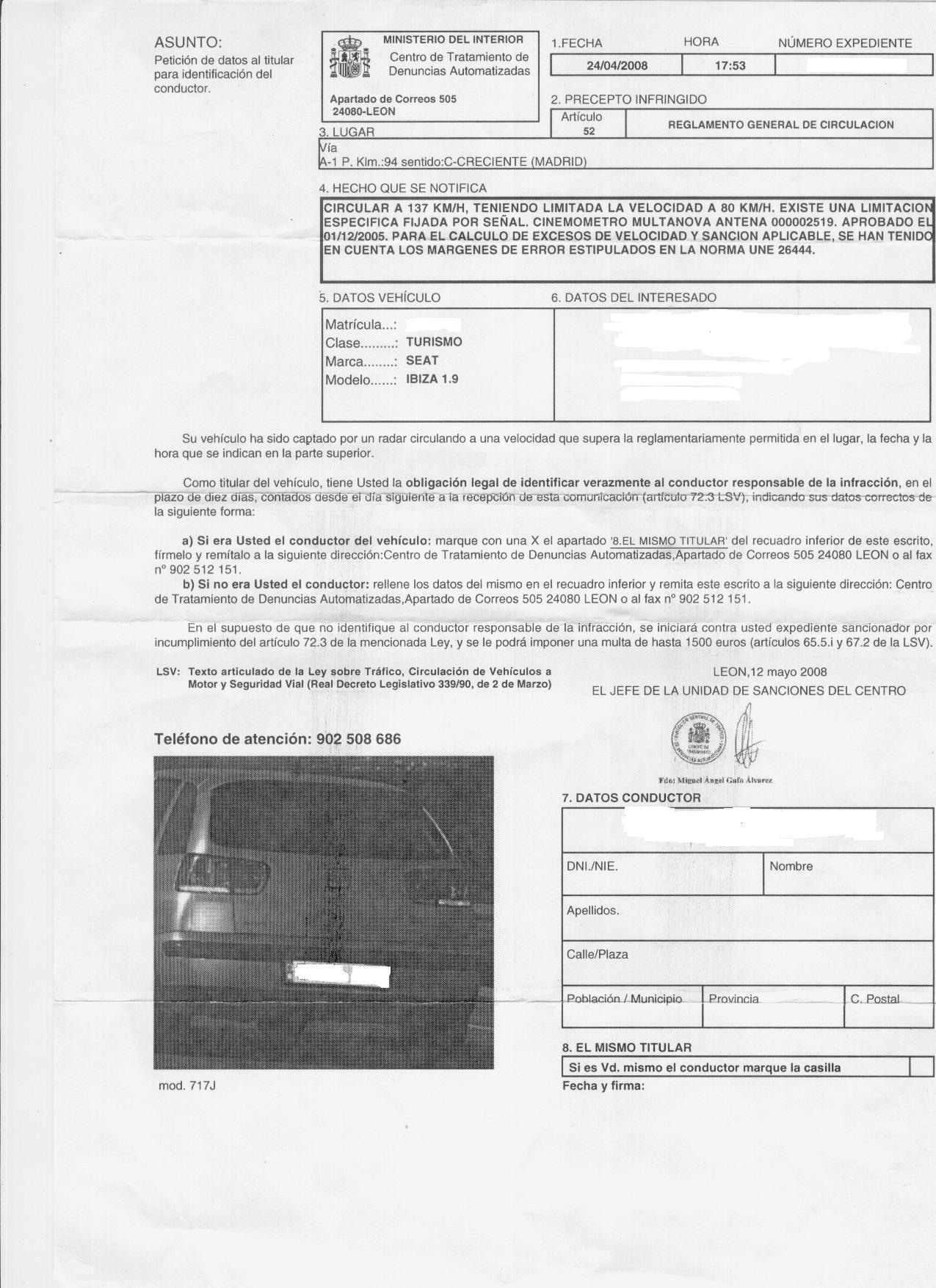 tpaga Publicado 7 de Julio del 2008 Reportar Publicado 7 de Julio del 2008 Pues a mi tambien me ha pillado el fijo del PK94, os adjunto la foto... He pasado mil veces por ese sitio pero ese dia me distraje, vi el flash por el retrovisor e inmediatamente miré mi velocímetro, marcaba ligeramente por debajo de 140. Pues bien, segun el radar iba a 137... A mi me da que hay truco, porque mi velocímetro marca unos 10 km/h más que la velocidad real, asi que estoy seguro que iba a menos de los 136 km/h que marcan la diferencia entre GRAVE y MUY GRAVE. Total que como para recurrir hay que identificar al conductor no me he arriesgado y he alegado que no sabia quen conducia ese dia. Ya me ha legado la multa, 760euros que con dereco a reduccion del 30% se queda en 532euros, os adjunto la copia. En fin, que te engañan con la velocidad para que creas que es mas grave, te acojonas y no identificas al conductor y asi te clavan mas pasta.<p><a href="https://www.todoradares.com/foro/uploads/monthly_2008_07/MULTA11.JPG.fc034f4de9e0782b21891f039e649269.JPG" class="ipsAttachLink ipsAttachLink_image"><img data-fileid="2293" src="https://www.todoradares.com/foro/uploads/monthly_2008_07/MULTA11.JPG.fc034f4de9e0782b21891f039e649269.JPG" class="ipsImage ipsImage_thumbnailed" alt=""></a></p><p><a href="https://www.todoradares.com/foro/uploads/monthly_2008_07/MULTA22.JPG.a51b0d98f975af7eee8b751aca57c069.JPG" class="ipsAttachLink ipsAttachLink_image"><img data-fileid="2294" src="https://www.todoradares.com/foro/uploads/monthly_2008_07/MULTA22.JPG.a51b0d98f975af7eee8b751aca57c069.JPG" class="ipsImage ipsImage_thumbnailed" alt=""></a></p> Citar