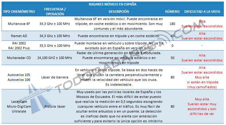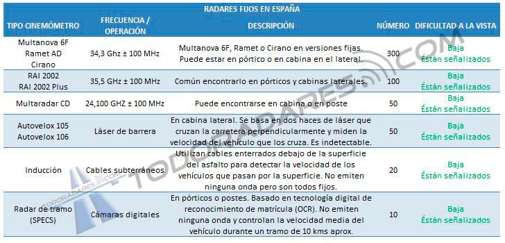 A continuación encontraréis unas tablas con las frecuencias de los radares existentes. Primero, haremos la separación por bandas y después por fijos y móviles en España.