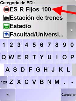 Ahí encontrara una lista de todos los POIs que tiene en su TomTom. Busque y seleccione los que corresponde a radares. Hay que configurara la alerta uno por uno. En este caso empezamos por el de los radares fijos de 100. Selecciónelo.