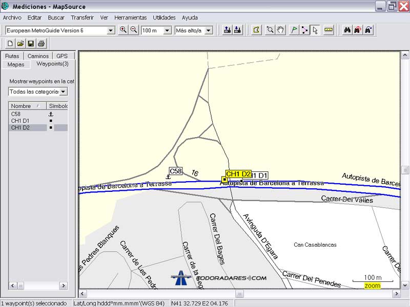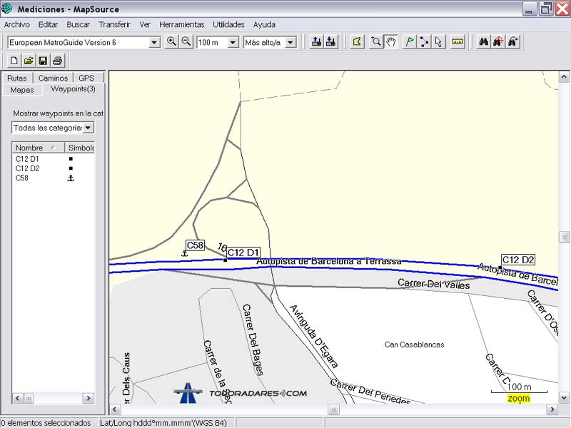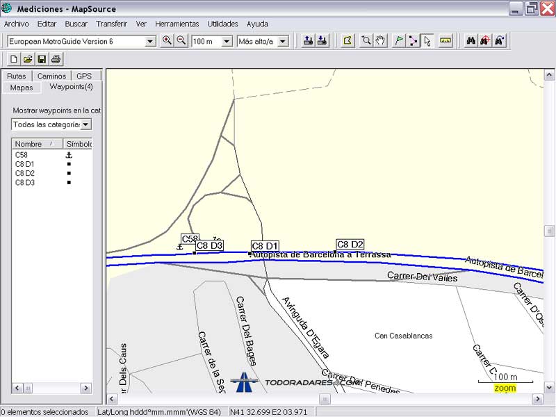 Se seleccionó este radar porque sirve de referencia a muchos usuarios de detectores. Este radar tiene una localización un tanto especial que lo hace ciertamente bastante inestable. Esta situado, justo al comienzo de la bajada de un cambio de rasante muy suave precedido de una curva de gran radio. Es el típico radar que un día lo detectas con bastante antelación y si vuelves a pasar al cabo de 5 minutos te lo comes. Solamente hemos probado 3 tipos de conos, los mas diferentes entre ellos. El método de obtención de las mediciones fue el siguiente: 2 pasadas seguidas Non-Stop con cada cono. No se han hecho 25 y se han escogido las 2 mejores. Con tantos conos seria imposible.