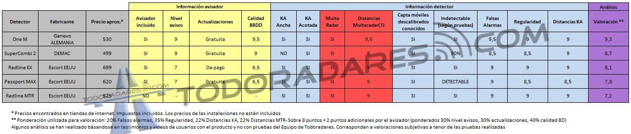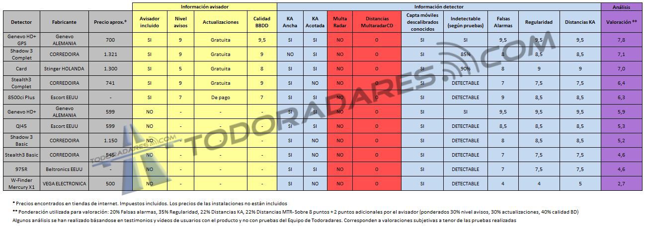 Tabla comparativa detectores de radar de instalación SIN detección de K MTR por orden de calidad
