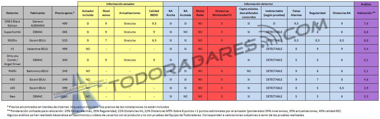 A continuación encontraréis unas tablas comparativa de los detectores de radar y antiradares existentes en el mercado. Sus puntos fuertes y sus puntos débiles, si tiene o no avisador GPS integrado y la calidad de éste, su precio, su efectividad y la recomendación de Todoradares.