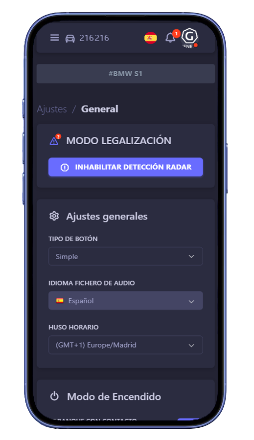 - Modo Legalización: Incluye un «Modo Legalización» para inhabilitar por completo la detección de radar cuando sea necesario, activable desde la app o el pulsador oculto.