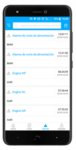 ![]() | Alertas en vivoCualquier incidencia relacionada con sus vehículos le será notificada de manera inmediata en su teléfono además de quedar registrada en la app. Las alertas son configurables y activables a gusto del usuario pudiendo elegir entre recibir aviso a través de app, de SMS, de llamada o combinación de las anteriores. |